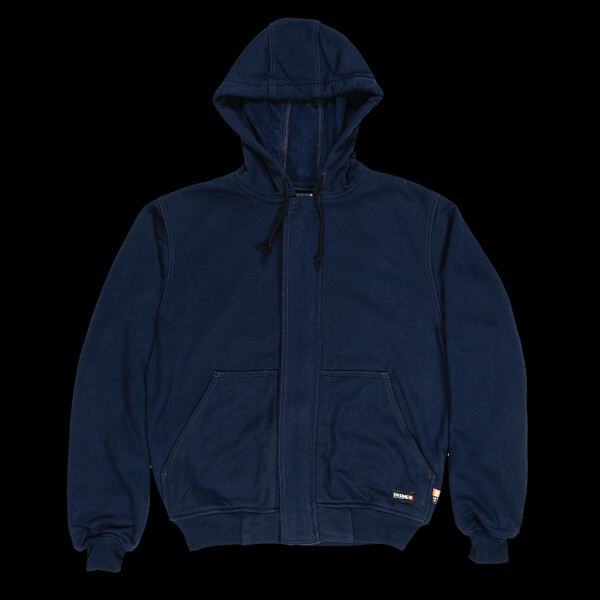 12 oz., 100% cotton flame resistant fleece; Flame resistant brass front zipper; Flame resistant rib knit cuffs; Meets the requirements of ASTM F1506, NFPA 70E, NFPA2112, and OSHA 1910.269; Flame resistant brass front zipper; Two-needle stitched main seams; Two front patch pockets; Relaxed fit;